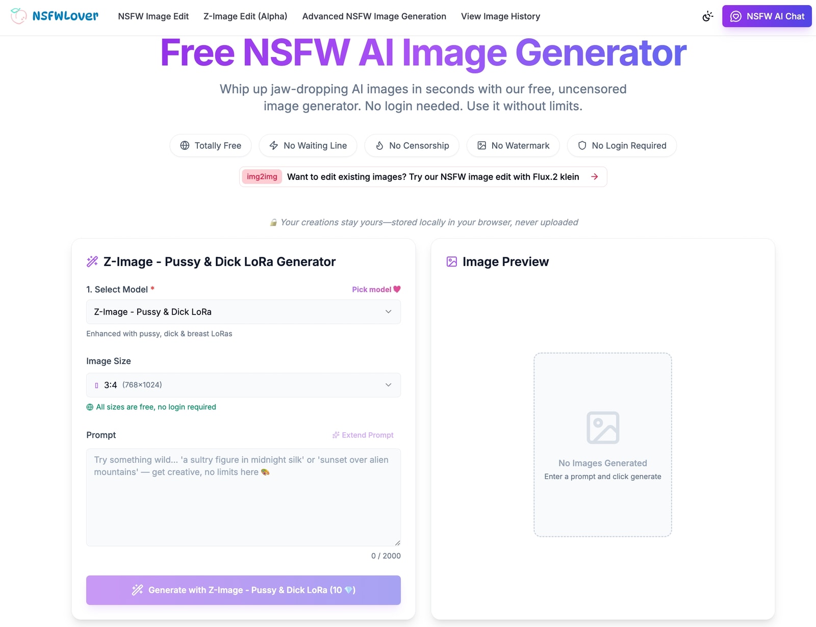 If you're still grinding through vanilla gens and hating life, quit torturing yourself. Head over to nsfwlover.com/nsfw-ai-image-generator, hunt down that Z-Image - Pussy & Dick LoRA (it's in the model selector or easy to spot), and fire it up. Free, instant, no gatekeeping. Your next wank material just got a massive upgrade.
